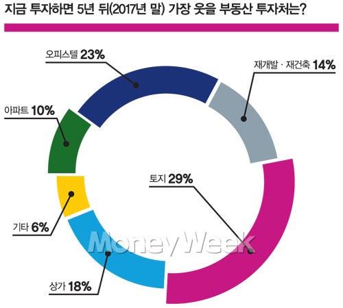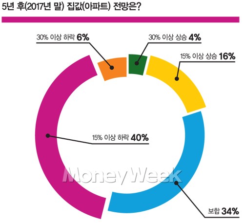 5년 후 부동산 지형은 어떻게 바뀔까. 머니위크가 창간5주년을 맞아 금융권 전문가 100명을 대상으로 설문조사한 결과를 보면 2017년 말 집값 전망은 보합세 내지는 15% 하락 수준에서 결정될 것으로 보는 시각이 상당히 많았다. 또 이익 환수 시점을 2017년 말로 잡았을 때 부동산 투자로 이익을 볼 수 있는 부동산은 토지와 오피스텔이 다수를 차지했다. 반면 아파트에 투자하라는 답변은 10%에 그쳤다.
