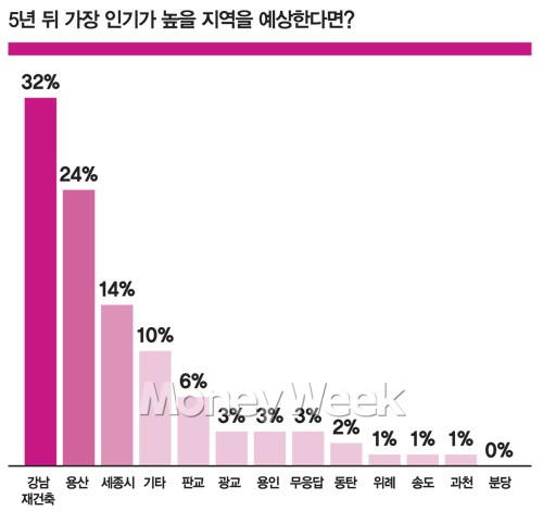 그렇다면 5년 뒤 부동산시장에서 각광받을 지역은 어디일까. 부동산시장의 하락세가 불가피한 가운데 여전히 전통적인 강세지역이 명맥을 이어나갈 것으로 전망된다. 재건축 수요가 많은 강남과 개발 압력이 높은 용산이 56%의 지지를 얻었다.
