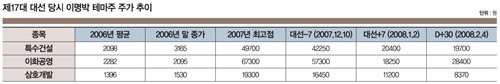 이명박 당시 후보의 '한반도 대운하' 공약으로 테마주에 합류한 이화공영, 삼호개발, 특수건설은 선거 직전 고점을 찍은 뒤 지속적으로 내리막길을 걸었다.