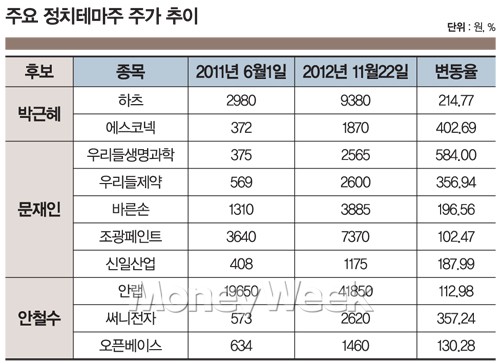 문재인 테마주로 분류되는우리들생명과학(208원 0%)의 주가(11월22일 기준)는 2565원으로 작년 6월1일 종가와 비교해 584%,우리들제약(3,865원 ▲20 +0.52%)은 356.94% 올라 있는 상태다. 같은 기간 박근혜 테마주인에스코넥(813원 0%)과 안철수 테마주써니전자(1,807원 ▲40 +2.26%)는 각각 402.69%, 357.24%의 상승률을 기록 중이다. 이들 종목이 테마주 광풍이 불기 전 수준으로 돌아오기 위해서는 주가가 현재의 4분의 1 이하로 내려와야 한다.