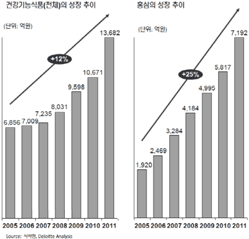 건강식품 시장의 절반은 홍삼이 차지하고 있다. 지난해 홍삼시장 규모는 약 7200억원(식약청 기준)으로 건강식품 시장의 53%에 달한다. 2005년~2011년까지 전체 건강식품 시장의 연평균 성장률이 12%인데 비해 홍삼시장의 연평균 성장률은 배에 달하는 25%라는 점에서 볼 때 홍삼이 건강식품 시장 확대를 이끌고 있다고 해도 과언이 아니다.