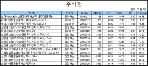 반면 같은 가치주 펀드지만 편입종목에 따라 성적이 부진했던 펀드도 있었다. 한국투자신탁운용의 한국투자중소밸류증권투자신탁(주식)(A)는 한 주간 -2.30%로 부진한 수익률을 기록했다. 미래에셋자산운용의 미래에셋성장유망중소형주증권투자신탁 1(주식)종류C5도 -0.87%, KB자산운용의 KB중소형주포커스증권자투자신탁(주식)C Class도 -0.66%로 주식형 펀드 평균수익률을 밑돌았다.