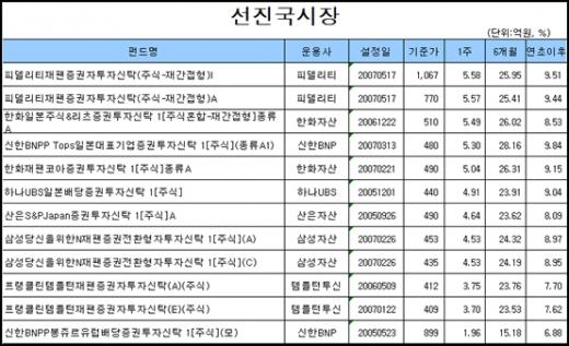 해외 주식형펀드는 선진국펀드가 신흥국펀드보다 상대적으로 우수한 성과를 보였다. 선진국 펀드 중에는 엔저 수혜로 수출 기업 주가가 급등한 일본펀드가 수익률 상위에 올랐다.