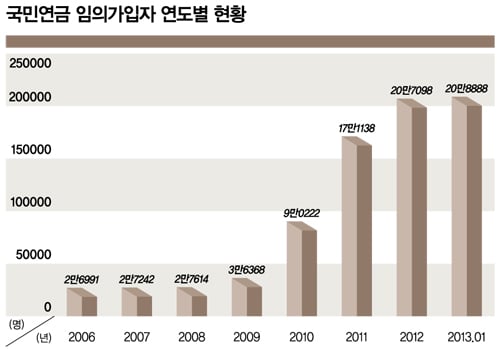 국민연금 임의가입자는 올해 1월 기준으로 20만8888명이다. 2009년 말 3만6368명이었던 임의가입자수는 2011년 17만1138명으로 대폭 증가하더니 작년 20만명을 돌파했다. 하지만 증가세는 2011년 이후 다소 완화되는 추세다.