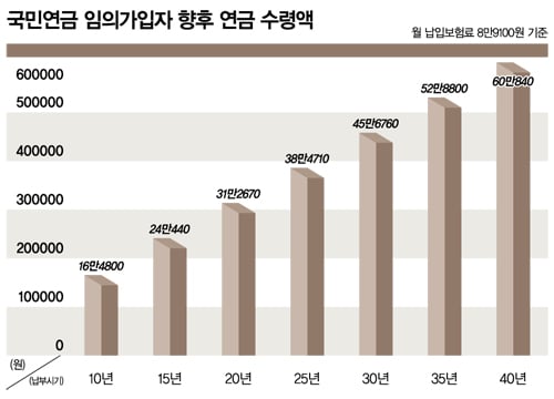 만약 임의가입자가 매달 최소납입금 8만9100원씩 10년을 납부하면 연금 수령시점에서 16만4800원을, 15년 납부 시 24만440원을, 20년 시 31만2670원을 각각 받게 된다. 연금을 가입하지 않아도 나라에서 20만원을 준다면 가입해서 얻는 연금액과 큰 차이가 없는 셈이다.