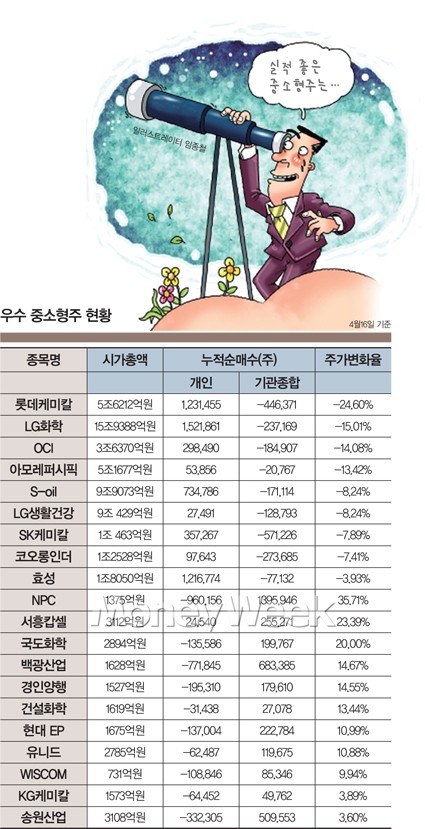 총체적 위기로 확대되지 않는 상황에서 지수가 지지부진하면 흔히 중소형주에서 대안이 나온다. 중소형주는 시가총액과 거래대금이 적어 기관의 관심을 덜 받지만, 선별해 투자하는 종목의 경우 기관들은 꾸준히 매수하는 경향을 보였다. 이때 해당 종목의 주가가 오르면 개인은 이익을 실현한다는 생각에 꾸준히 팔아치웠다. 하지만 팔고 난 뒤 주가가 더욱 올라가는 모습이 반복됐다.