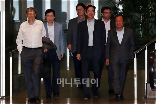 빌게이츠 MS 이사회 의장 겸 빌앤드멜린다게이츠재단 이사장이 21일 서울 서초동 삼성전자 본사에서 이재용 삼성전자 부회장(왼쪽 세번째)과 최지성 삼성 미래전략실장(왼쪽 두번째), 신종균 삼성전자 IM부문장(오른쪽 첫번째) 등과 3시간의 만찬 회동을 한 후 돌아가고 있다.