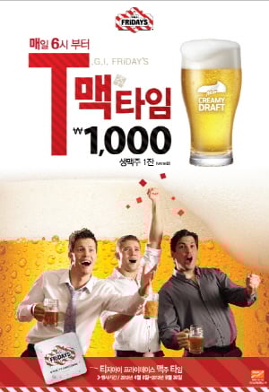 패밀리 레스토랑 T.G.I.프라이데이스(www.tgif.co.kr)는 오는 9월 30일까지 100% 보리 생맥주 ‘맥스生’을 부담 없는 가격으로 즐길 수 있는 ‘T맥타임 이벤트’를 진행한다.