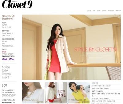 클로젯나인 사이트에 들어왔을 때 고객들이 가장 먼저 느끼는 인상은 ‘밝다’는 것이다. 요즘 시즌에 맞게 화사하고 깨끗한 의류가 주를 이룬다.