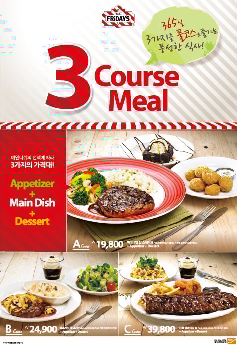 이번에 출시된 T.G.I.프라이데이스의 세트 메뉴 ‘3코스밀(3 Course Meal)’ 하루 종일 할인 혜택이 적용되는 코스형 메뉴로 3가지 메뉴의 3色 Course 개념을 도입 시킨 신개념 코스형 메뉴이다.