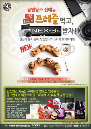 탐앤탐스는 이번 신메뉴 출시를 기념하여 이벤트를 진행하고 있다. ‘탐앤탐스 크랩·라이스프레즐 먹고 SONY NEX-3N 받자!’ 이벤트는 탐앤탐스 구매 영수증을 지참한 고객이라면 누구나, 홈페이지 회원 가입만 하면 응모가 가능하다.