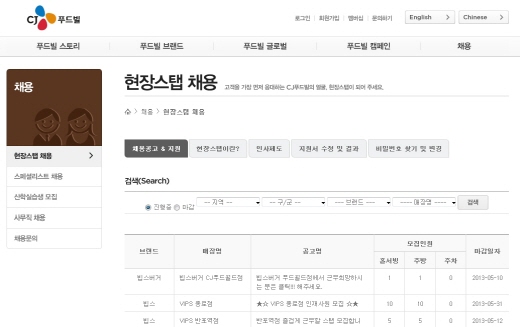 기존에 개별적으로 운영되던 브랜드 별 스태프 모집 공고를 이제는 CJ푸드빌 기업 홈페이지(www.cjfoodville.co.kr)의 채용 카테고리에서 한번에 확인할 수 있게 됐다.