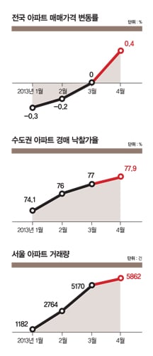 거래시장도 사람들의 발길이 늘었다. 집값이 오르고 거래량도 증가했다. 국토교통부에 따르면 지난달 전국 주택거래신고 물량은 6만9529가구로 3월(6만6618가구) 대비 4.4% 증가했다. 올해 들어 처음으로 작년 동월대비 증가세로 돌아선 것이다. 수도권의 주택거래량도 4월에 2만9092건으로 작년 동월대비 12.4% 증가했다. 서울의 경우 5862건으로 '거래절벽'이라 불리던 1월(1182건)보다 5배가량 늘었다. 강남 3구(강남·서초·송파)의 거래량은 지난해 같은 기간보다 무려 70%나 증가했다.