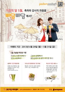 이번 이벤트는 빠담빠담 전국 매장에서 3만원 이상 주문하고 5월 기념일의 주인공이 있는 테이블에 생맥주 1잔 무료쿠폰을 지급한다.