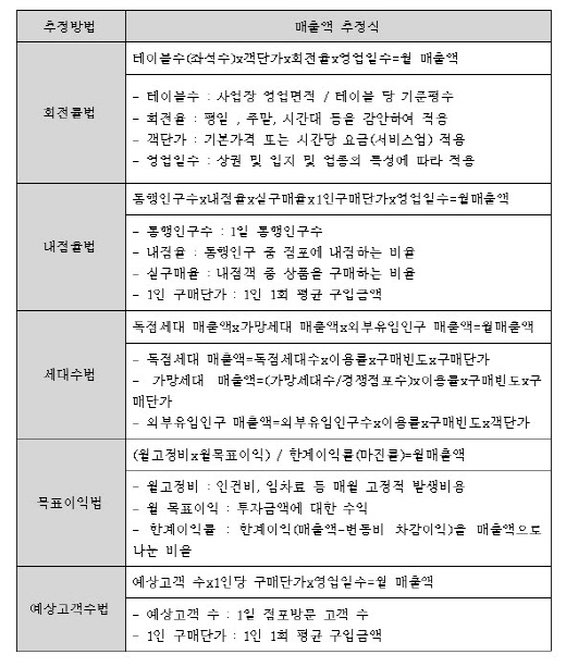 예를 들어 외식업의 경우 15테이블이 완벽하게 3회전(객단가 4만원의 경우) 이상 운영되고 30일 영업할 때를 기준으로 한다면 예상매출이 5천4백만원이 되고 여기에 수익률을 30%로 하여 1천6백만원의 수익을 올릴 수 있다는 식이다.