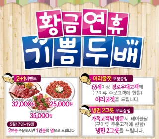 먼저, 17~19일까지 역삼점은 왕양념갈비를, 서초점과 여의도점은 한우광양불고기·왕양념갈비·한우모둠구이 메뉴를 2인분 시키면 1인분을 추가 증정하는 알뜰외식 행사를 하루 종일 진행한다.
