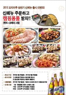 외식 전문 프랜차이즈 기업인 ㈜이안에프앤비(대표이사 임은경)에서 운영중인 한국식 수작 프리미엄 꼬치구이 전문점 꼬지마루(www.cozymaru.co.kr)가 전국 매장에서 2013년 상반기 신메뉴 출시를 기념해 ‘신메뉴 주문하고 캠핑용품 받자’ 이벤트를 오는 6월30일까지 진행한다.