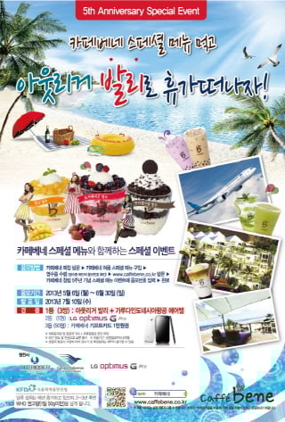 5월 한달 간, 카페베네 페이스북(www.facebook.com/caffebene)에 망고, 요거베리굿, 쿠키앤크림 빙수 3종 모두를 먹는 모습이나 자신의 특별한 애장품을 함께 찍은 사진을 올린 분께는 영화예매권을 제공하며, 추첨을 통해 선택된 1분께는 옵티머스 G프로를 증정한다.