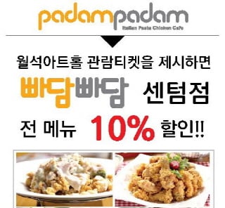 이탈리안 파스타치킨 카페 빠담빠담(www.padampadam.kr)의 부산센텀점은 월석아트홀에서 진행중인 ‘앤서니 브라운의 동화책 속 세계여행’을 할인된 가격에 관람할 수 있는 이벤트를 독자적으로 진행중이다.