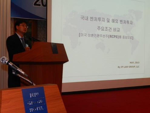 이종건 법무법인JP 변호사는 23일 제주 그랜드호텔에서 열린 '2013 벤처캐피탈 사장단 연찬회'에서 "미국과 우리나라의 상환전환우선주(RCPS) 투자 조건을 봤을 때 미국의 권리 보장 수준이 더 높다"며 "우리나라의 경우 미국과 마찬가지로 투자 계약서에 상환권과 잔여재산분배권, 주식매수청구권 등을 넣고 있지만 실제 권한을 행사할 상황에서는 효력을 발휘하지 못할 수 있다"고 말했다.