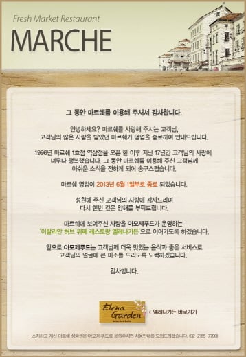 관련업계에선 아모제푸드는 마르쉐 대신 푸드캐피털·엘레나가든 등 자체 외식브랜드에 주력하겠다는 방침이라고 전했다.