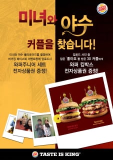 ‘미녀와 야수를 만나다’ 프로모션은 강남, 홍대, 신촌 등 젊은 층이 밀집하는 지역 일대에서 진행되는 사진 찍어주기 이벤트로 거리에서 버거킹 크루가 ‘미녀와 야수’ 커플로 선정된 고객들에게 폴라로이드 사진을 찍어준다.