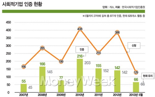 윤종태 한국사회적기업진흥원 기획홍보팀장은 "최근 6년 중 가장 많은 인증기업이 탄생한 해는 2010년인데 당시 216개의 기업이 사회적기업 인증을 받았다"며 "그런데 올 한해에만 200~250개의 사회적기업이 새롭게 탄생할 것으로 추정된다"고 말했다.