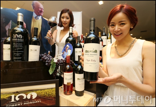 신동와인(대표 이종훈)이 13일 오전 서울 소공동 롯데백화점 본점 지하1층 와인매장에서 미국 와인을 대표하는 인물인 '로버트 몬다비' 100주년을 기념하는 할인 행사를 진행, 모델들이 제품을 선보이고 있다.