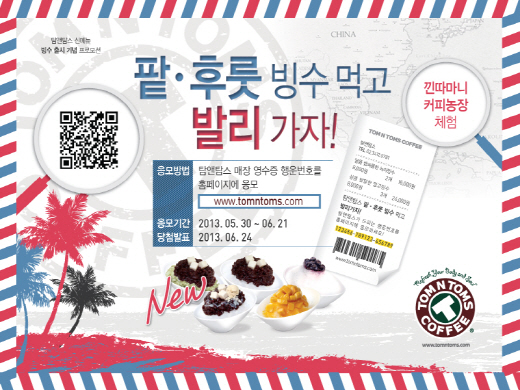 커피 프랜차이즈 전문브랜드인 '탐앤탐스'는 2013년 빙수 신메뉴 5종 출시를 기념하여 인도네시아 발리 커피농장 체험 여행상품을 증정하는 <팥·후룻 빙수 먹고 발리 가자!> 이벤트를 오는 21일까지 진행중이다.