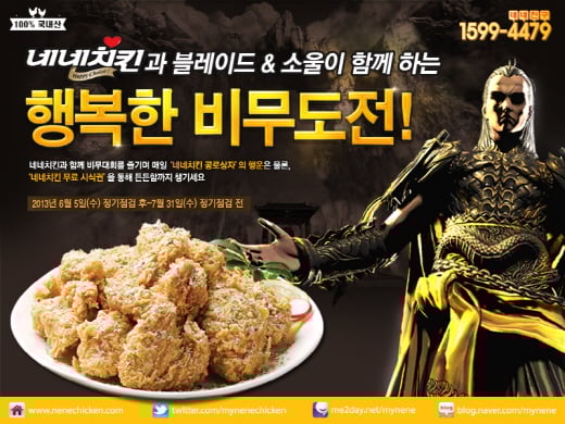 한편, 네네치킨은 지난 3월 NC다이노스 협약식을 계기로 엔씨소프트와의 인연을 맺고, 전략적 공동 제휴 마케팅을 함께 진행해 나가기로 했다. 첫 번째 이벤트로 ‘네네치킨 배 비무대회’를 진행한다.