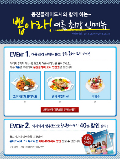 추첨을 통해 매주 7명에게는 웅진플레이도시 입장권 (1인2매)를 증정한다. 이벤트는 8월 31일까지 진행되며, 당첨자는 매주 금요일 홈페이지 및 개별 연락을 통해 공지한다.