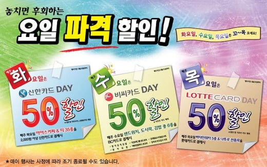 편의점 세븐일레븐(대표 소진세)은 지난 4월 비씨카드에 이어 롯데, 신한 등 주요 카드사와 추가 업무 제휴를 맺고 특정 요일에 해당 카드로 상품 결제 시 50% 할인 판매하는 요일 행사를 확대 운영중이다.