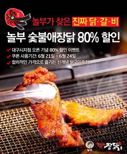 종합외식전문기업 ㈜놀부NBG(www.nolboo.co.kr, 대표 김준영)의 프랜차이즈 닭갈비 전문 브랜드인 '숯불애장닭'이 쿠팡과 함께 숯불닭갈비(매운맛+순한맛) 2인분을 80%할인된 가격인 2,500원에 판매하는 이벤트를 오는 20일부터 29일까지 진행한다.
