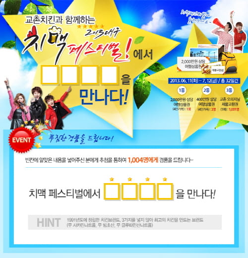 먼저 ‘치맥페스티벌에서 0000을 만나다!’라는 빈칸 맞추기 이벤트를 통해 푸짐한 상품을 제공할 예정이다.