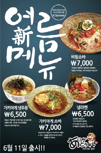 가격은 가키아게 냉우동과 냉라면은 6,500원이고 가키아게 소바, 비빔 소바는 7,000원이다.