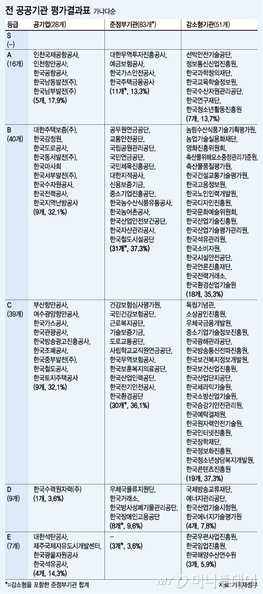 '원전비리'로 집중포화를 맞고 있는 한국수력원자력을 비롯해 지난해 B등급에서 이번에 E등급으로 추락한 한국광물자원공사와 지난해 D등급에서 E등급으로 떨어진 한국석유공사, 한국석탄공사 직원들은 한푼도 못받는다. 평가 등급이 나쁜 탓에 1년새 수백~수천만원의 성과급이 날아간 것이다. 공기업 직원들이 공공기관 평가에 촉각을 곤두세울수 밖에 없는 이유이다.