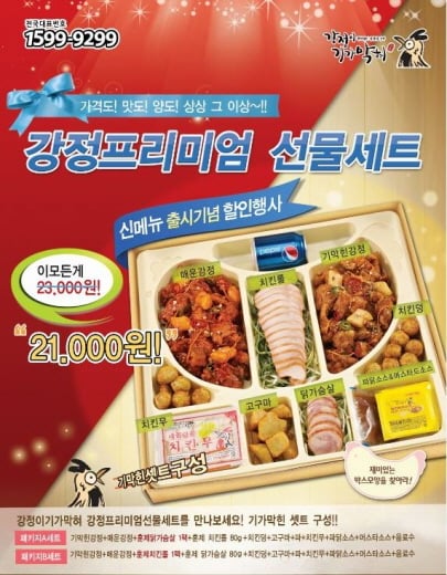 이번에 선보인 ‘프리미엄 패키지세트’는 가족 또는 단체모임에서 즐겨먹을 수 있는 메뉴로서 강정(매운맛, 달콤한맛), 훈제(닭가슴살, 닭다리살), 고구마, 치킨, 치킨덩(닭다리살)으로 구성되어 있다.
