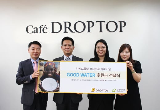최고의 장소, 최상의 커피를 표방하는 프랜차이즈 카페 드롭탑(DROPTOP, www.cafedroptop.com)이 굿네이버스에서 진행하고 있는 ‘굿 워터 프로젝트’ 캠페인에 후원금을 전달했다.