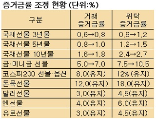위탁증거금률은 국채선물 3년물의 경우 0.9%에서 1.2%로, 5년물의 경우 1.2%에서 1.5%로, 10년물의 경우 2.4%에서 2.7%로 오른다.