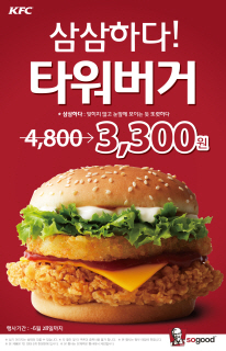 패스트푸드 전문브랜드인 'KFC'가 28일까지 인기 메뉴 ‘타워버거’ 할인 행사를 진행한다.