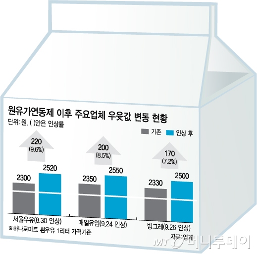빙그레의 가격 인상으로 유업계의 우윳값 인상은 일단락될 전망이다. 빙그레가 리터당 170원(7.2%)으로 가장 낮고, 매일유업은 200원(8.5%), 서울우유는 220원(9.6%) 수준이다. 우윳값 인상의 주 배경인 원유가 인상은 리터당 106원으로 모든 유업체에게 똑같이 적용됐지만 실제 인상폭이 다른 것은 업체마다 사정이 달라서다.