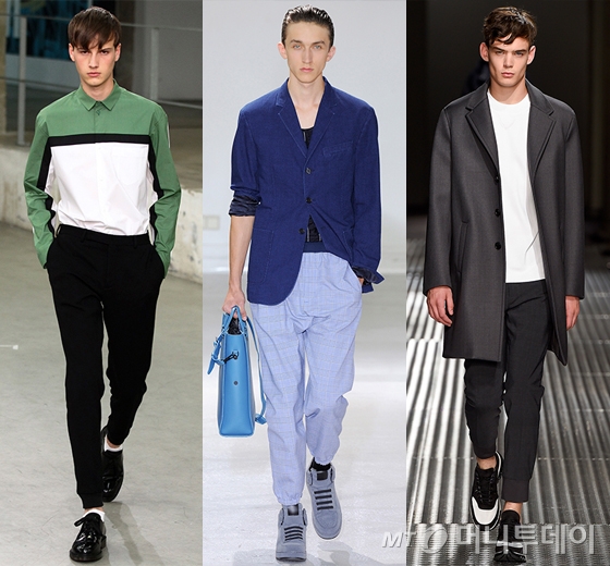 예시¹=발목의 밴드 위로 천이 심하게 접히거나 주름이 생기지 않도록 알맞은 길이를 선택하는 것이 핵심. 주름이 많이 생기거나 엉덩이 부분이 쳐지는 배기 스타일은 자칫 다리가 짧아보일 수 있다. 정장 팬츠에 사용되는 면, 폴리레이온 등의 소재와 허리선이 밴딩이 아닌 트라우저 형태로 돼 있는 조거팬츠는 클래식한 세미 슈트룩을 연출한다.