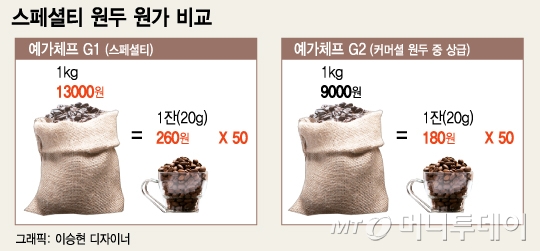 실제로 생두를 취급하는 한 대형업체의 스페셜티 생두(92점) 가격은 kg당 1만3000원 정도. 스페셜티 바로 아래 등급인 생두(1만원)보다 약 3000원 비싸다. 1잔의 커피를 만드는데 20g의 원두가 쓰인다고 가정할 때 스페셜티 커피와 일반 커피의 원가는 각각 260원과 180원 정도다.