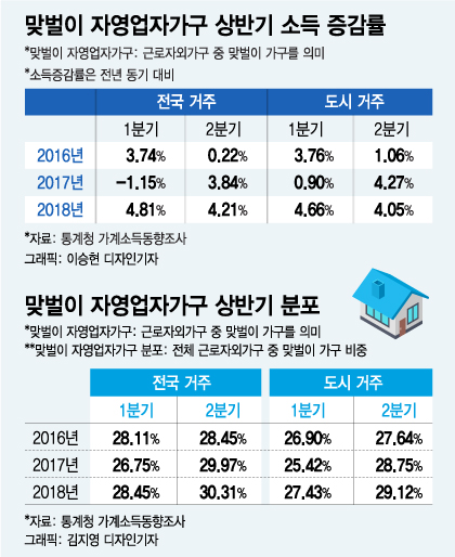 이는 올해 급격한 최저임금 인상으로 자영업자 폐업이 늘었다는 일각의 주장과는 정면으로 배치되는 통계다. 만약 최저임금 상승으로 인건비 부담이 늘어 자영업자의 폐업이 늘었다면 통계청 소득통계에서 (맞벌이) 자영업자가구 비중은 줄었어야 한다. 올해 통계청의 소득통계 표본가구 규모는 8000가구로 지난해 5500가구보다 늘어났다. 표본가구수가 늘어날수록 가계소득동향조사의 신뢰도가 올라간다.
