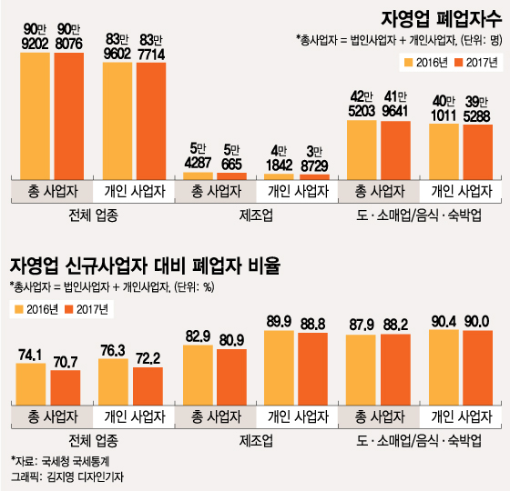 그리고 국세청의 국세통계에서도 문재인 정부 첫 해인 지난해 자영업 폐업자수가 감소한 것으로 나타났다. 최저임금 인상의 영향을 상대적으로 많이 받을 것으로 예상된 영세 개인사업자가 많이 몰려 있는 도·소매업과 음식·숙박업에서도 자영업 폐업자수가 수천명씩 줄었다.