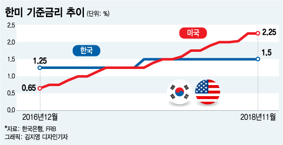 가장 큰 이유는 미국 연준의 금리인상 기조다. 이미 한미 간 기준금리는 역전된 상태고, 12월 연준에서 금리를 인상하게 될 경우 한미 간 금리차가 1.0%포인트까지 벌어지게 된다.