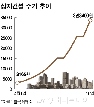 상지건설은 지난 2일부터 이날까지 거래정지가 된 10일과 15일을 제외하고 11거래일 중 9거래일 동안 상한가를 기록했다. 이달 들어(4월1일 시가~4월16일 종가) 3400원에서 3만3400원까지 882.35% 치솟았다.