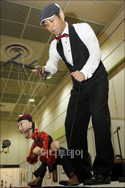 이날 오후 2시 서울 삼성동 코엑스(COEX) 1층 홀A전시장에서 열린 서울인형전시회 특설무대에서는 나루극단의 신동호 단장이 30~40개의 줄로 섬세한 움직임을 표현하는 다양한 마리오네트 인형을 소개했다.