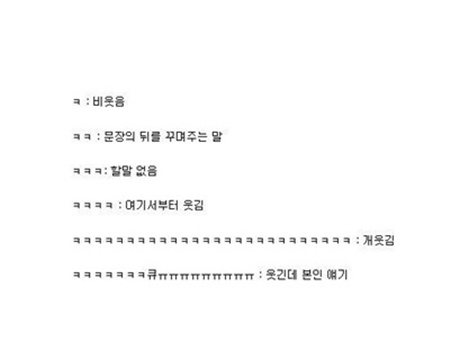 게시물에 따르면 'ㅋ'가 한 개일 때는 비웃음을 의미하고, 두 개일 때는 문장의 뒤를 꾸며주는 말이며 'ㅋ'가 세 개일 때는 할 말이 없다는 뜻이다. 네 개 부터는 웃기다는 의미인데 웃긴 정도는 'ㅋ'의 개수에 따라 달라진다. 끝으로 'ㅋ'를 나열한 뒤 슬픔·울음을 뜻하는 'ㅠ'가 이어지면 '웃기긴 한데 내 이야기 같아 슬프다'라는 뜻이라고 게시물은 밝히고 있다.