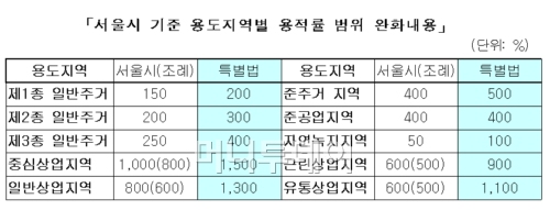 ◇호텔 용적률 확대, 의료기관 부대시설 허용=문화부는 우선 서울시를 기준으로 호텔에 대한 용적률 적용범위를 일반 주거지역에선 최대 400%까지, 상업지역에선 최대 1500%까지 각각 확대한다.